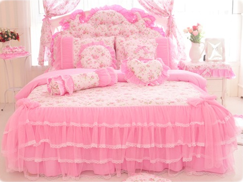 Pink Lace Princess Cotton Bedding Set King Queen 4pcs Duvet Cover Bed Skirts New