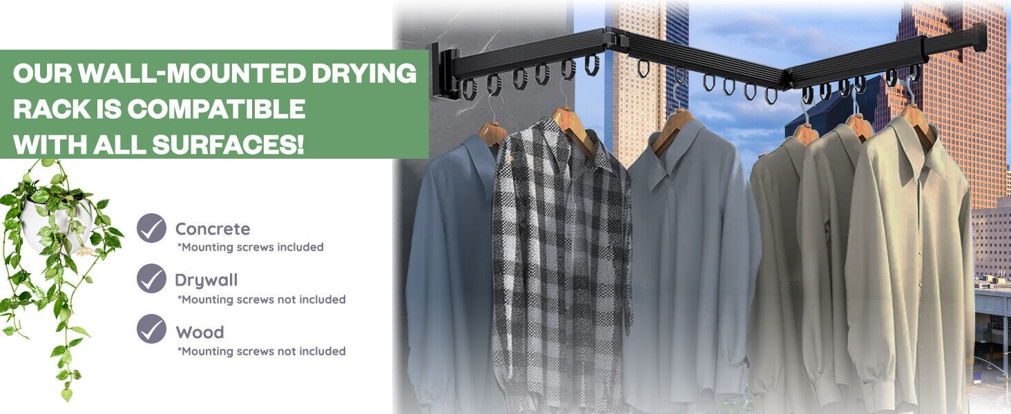 Wall Mounted Clothes Hanger Rack Laundry - Retractable & Collapsible Tri-Fold